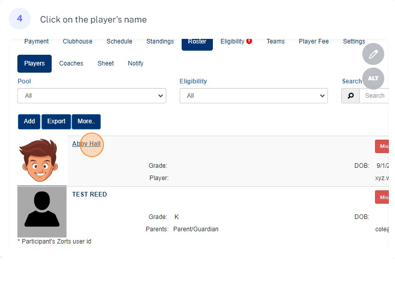 2. Select "ROSTER" for the team and participant you would like to edit.