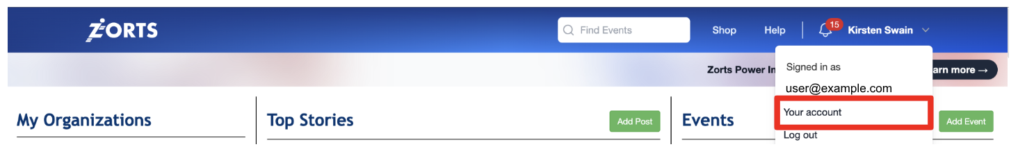 1. After logging into your account at https://zortssports.com, select your name from the top right corner of the screen.