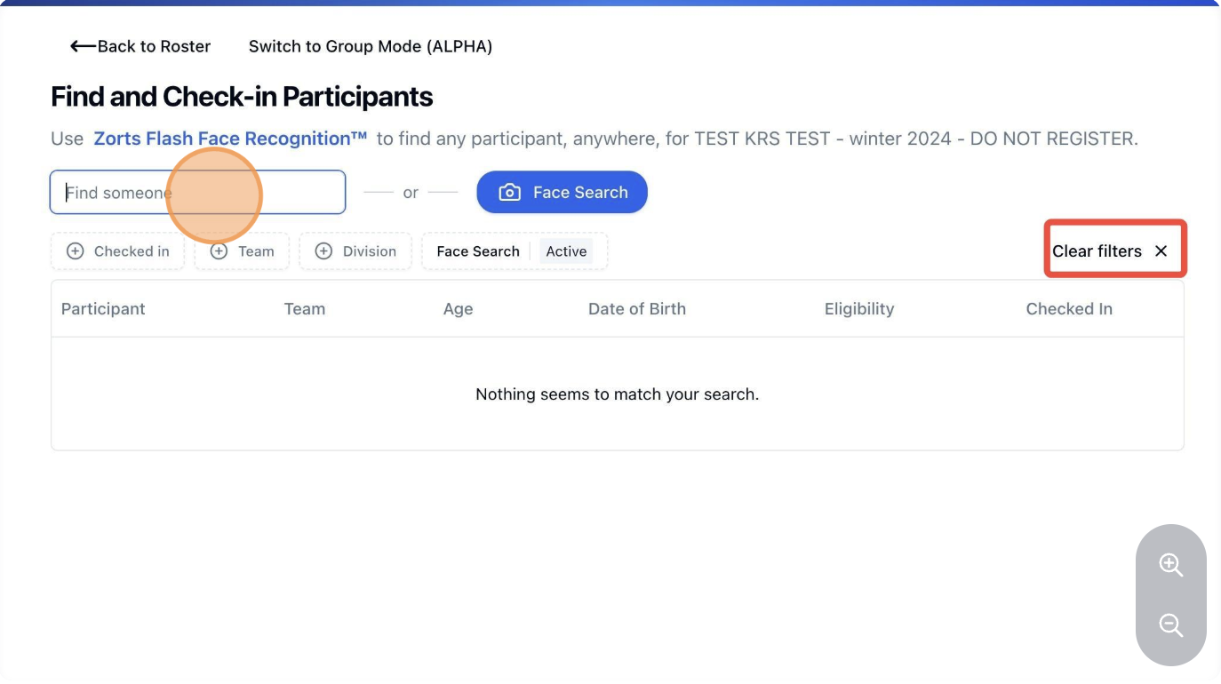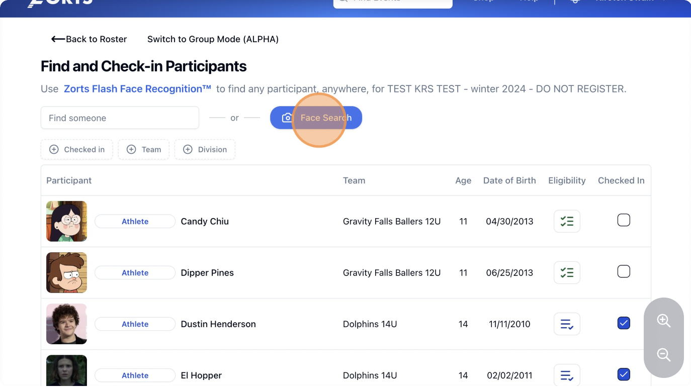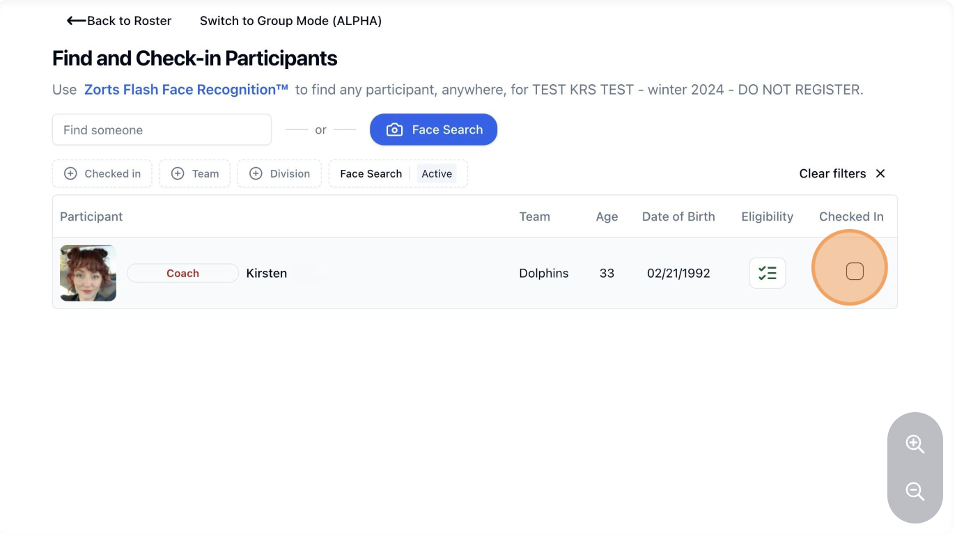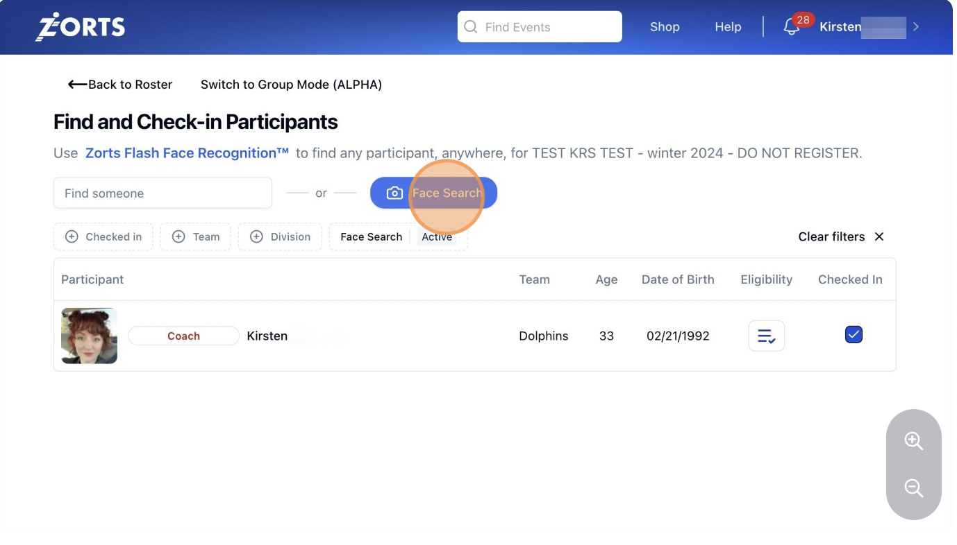 9. To check in the next participant or coach, click 'Face Search' again.